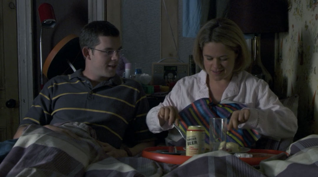 George: Well I shall explain. You’ve just done the night shift so for you it’s breakfast time, but it’s two in the afternoon so technically it’s lunch. The feast before you now has been specifically designed to combine the best bits of those two meals. Eggs benedict, choc ice, can of ginger beer… cigarette.