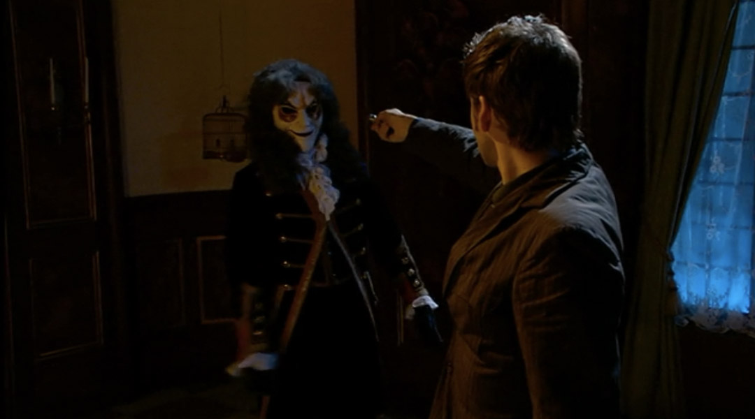 The Doctor: Just a bit scared, yeah. Just a little tiny bit. ‘Cause you see, if this clock’s broken—and it’s the only clock in the room… {the ticking gets louder.} Then what’s that? ‘Cause you see, that’s not a clock. You can tell by the resonance. Too big. Six feet I’d say. Size of a man.